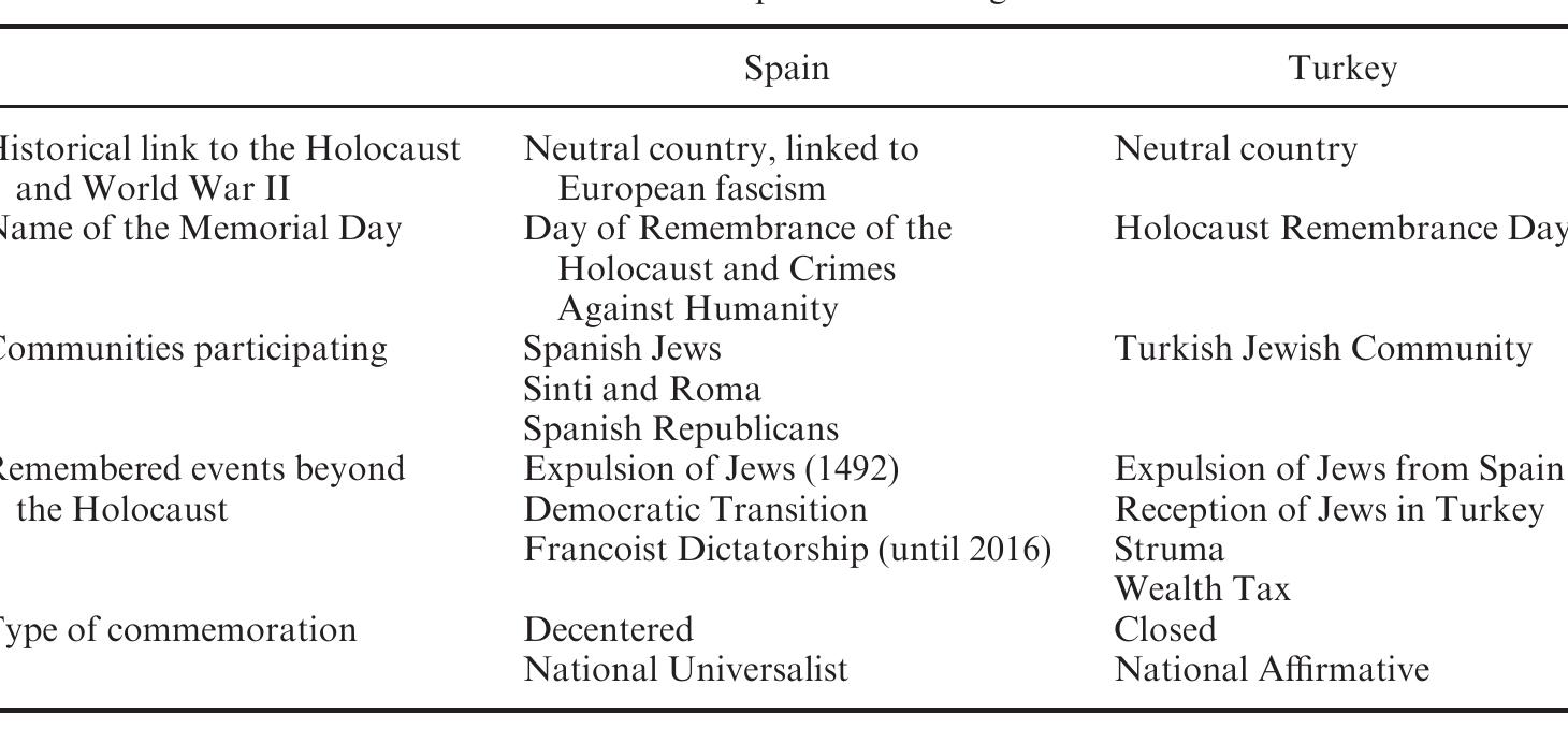 In this article, we analyze local Holocaust Remembrance Day (HRD) ceremonies promoted by the Inte... more In this article, we analyze local Holocaust Remembrance Day (HRD) ceremonies promoted by the International Holocaust Remembrance Alliance (IHRA) in Spain and Turkey. We investigate whether these memory practices have the potential to lead to a cosmopolitan engagement with the host countries' own pasts. Focused on the same memorial events in highly contrasting and diverse national contexts, this article examines how supranational memory discourses are adopted and reinterpreted within the nation-state framework. In both cases, especially in Turkey, the national legitimation profiles are bolstered by the universal frameworks that Holocaust memory provides. Even though memory travels transnationally, the nation-state still is the most powerful translator of this past.